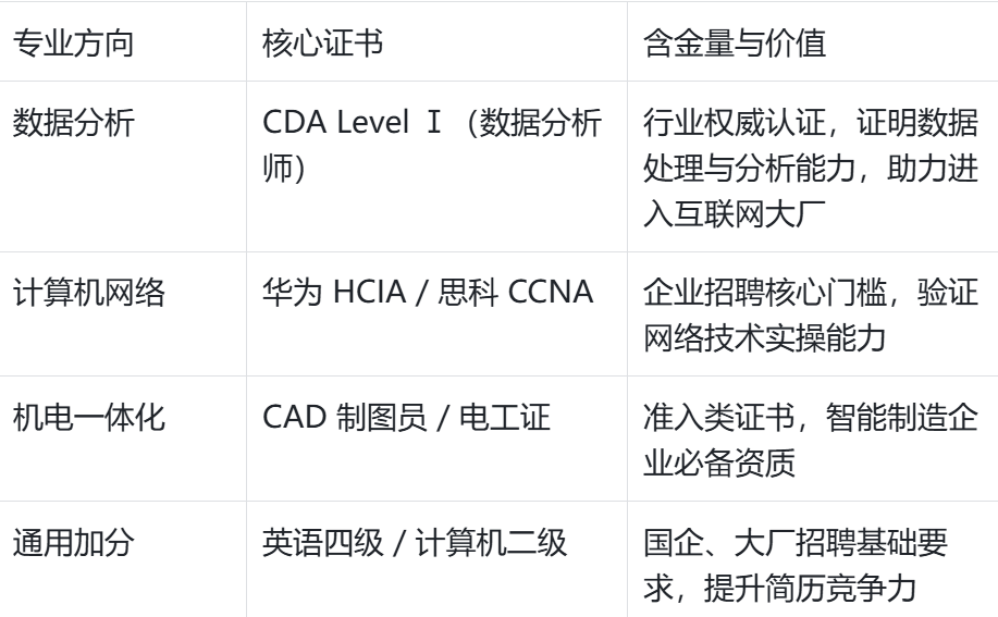 定向冲破:数据阐发进修 Python(pandas 库)取 PowerBI 可视化;计较机标的目的攻坚华为 HCIA 认证内容;机电专业实操工业机械人运维。