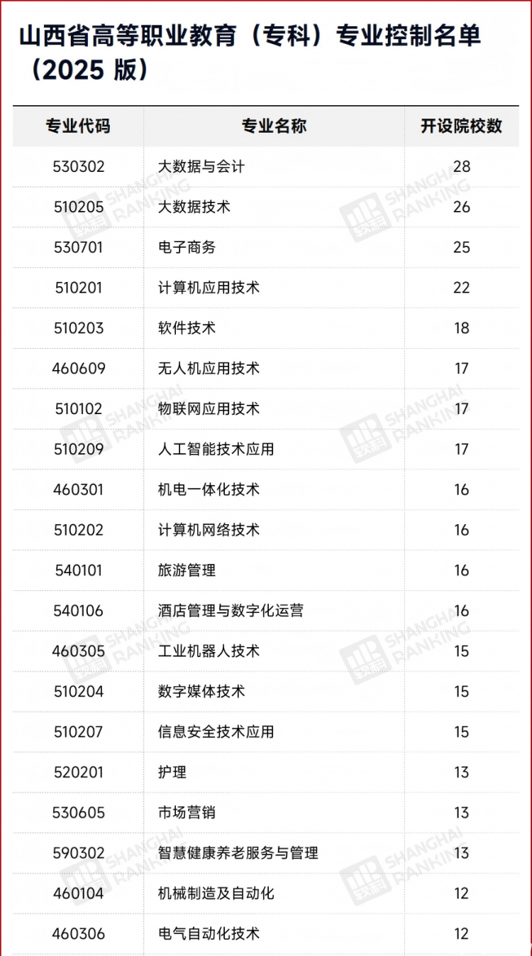 从各省市发布的专业调整相关指点性文件也可看出,专业布点规模是触发专业预警的“信号灯”。多地对于“布点规模大”的专业都明白暗示要严控增量。例如《山西省高档职业教育(专科)专业节制名单(2025版)》中列出了33个开设院校数大于等于10所的专业。