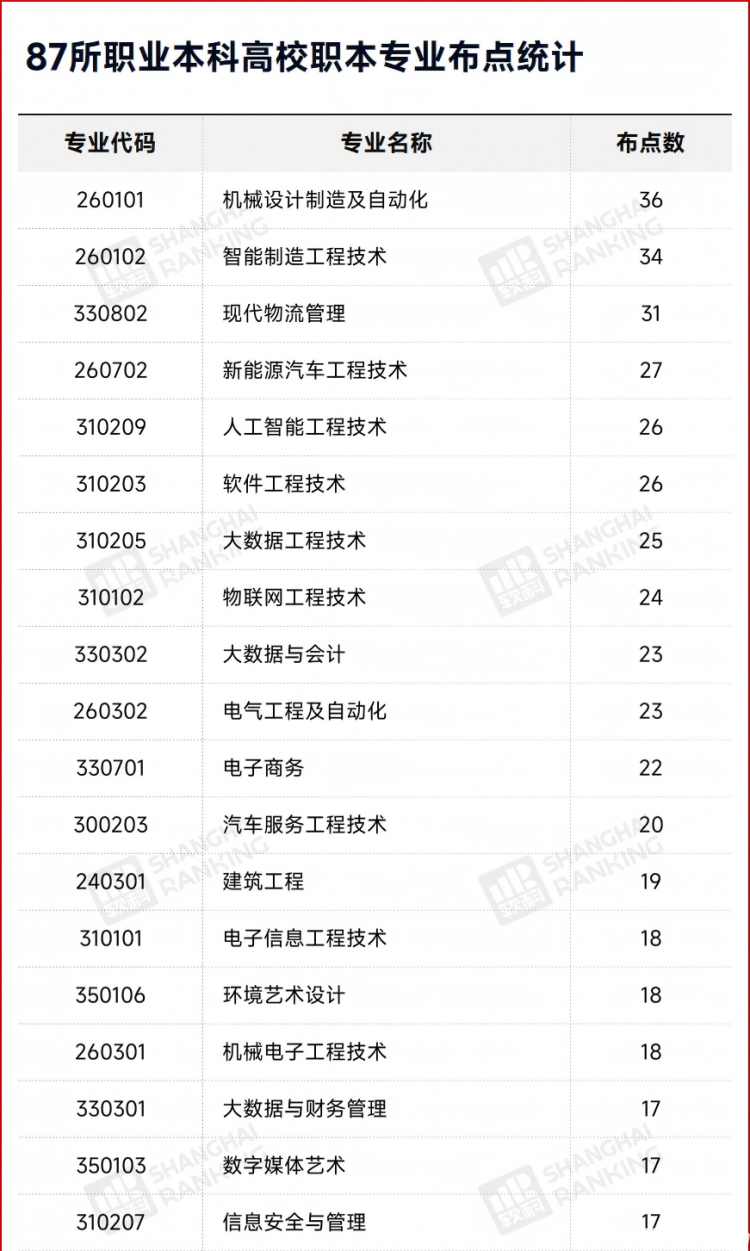 此外,软科职教基于全国职业院校专业设置办理取公共消息办事平台中,各省市高职专科2025年拟招生专业存案环境,对各地专业布点环境进行了统计。统计成果显示,大数据取会计、电子商务、机电一体化手艺、旅逛办理等28个专业正在全国31个省市中布点数位列Top3。此中,大数据取会计和电子商务正在全国超20个省市布点数量均位居前三。自2019年职业本科试点以来,职本专业连续开设布点。但无论是拟升本院校申报首批职本专业,仍是已升本院校新增职本专业,当前的布点环境也是专业规划设置的主要参考。据软科职教统计,当前教育部发函核准设立的87所职业本科大学,共计有1239个职业本科专业点(统计自各校2025年招生打算)。此中布点数量最多的专业是机械设想制制及从动化(36个),87所职本院校中有超40%的院校已开设了此专业,笼盖20个省市。