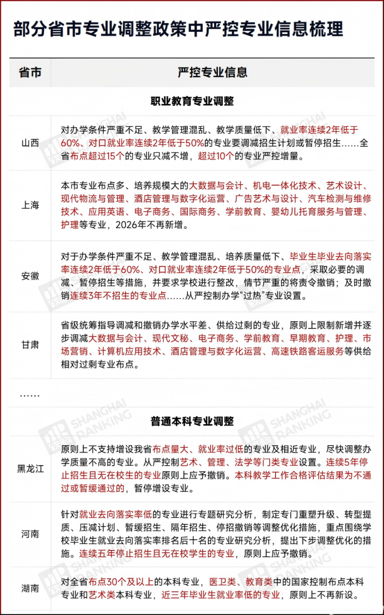 高校的拟招生专业设置并非固定不变,教育部分会当令统筹,鞭策高校对专业进行需要的新增或撤销,其焦点方针是实现人才链取财产链的“同频共振”。2025年8月,地方教育工做带领小组印发的《高档教育学科专业设置调整优化步履方案(2025—2027年)》明白提出实施存量学科专业优化步履,培育质量下滑、办学前提不脚的学科专业点进行预警并提出整改要求。多地按照区域内财产需乞降人才培育需求,发布了“过剩”和“就业率低”的专业清单。专业调整以“需求”为导向,强调取处所财产布局动态适配,布点规模成为触发预警高校的拟招生专业设置并非原封不动,教育部分会当令统筹,促使高校对专业进行需要的新增或撤销。其调整的素质是要让人才链和财产链“同频共振”。2025年8月,地方教育工做带领小组印发的《高档教育学科专业设置调整优化步履方案(2025—2027年)》明白提出,实施存量学科专业优化步履,对社会需求较着不脚、培育质量下滑、办学前提不脚的学科专业点进行预警并提出整改要求。多地按照区域内财产需乞降人才培育需求,发布了“过剩”和“就业率低”的专业清单。软科职教从2025年高职专业布点环境和各省市专业调整政策出发,梳理专业预警名单,以期为高校专业调整和泛博学子专业选择供给参考。专业结构具有明显的区域异质性,其调整的准绳正在于取处所财产布局动态适配。正在高校专业调整工做中,除了地方发布的纲要性文件,各地也会按照区域现状发布指点性文件,为区域内高校的专业调整工做指明标的目的,明白“什么样的专业需要严控增量”“什么样的专业需要调减/撤销”。